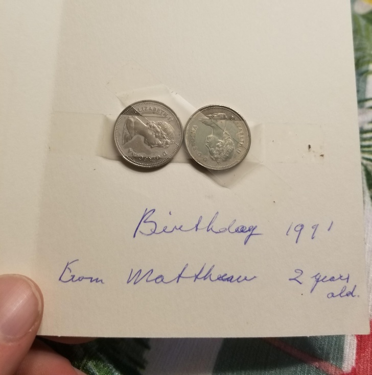 9. “My mum found this card in the house of my granny. Obviously, when I was 2 I gave her 10 cents on her birthday and she stuck it onto a wallet and kept it all her life.”