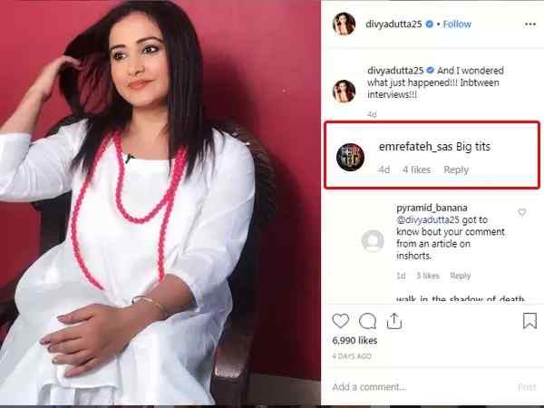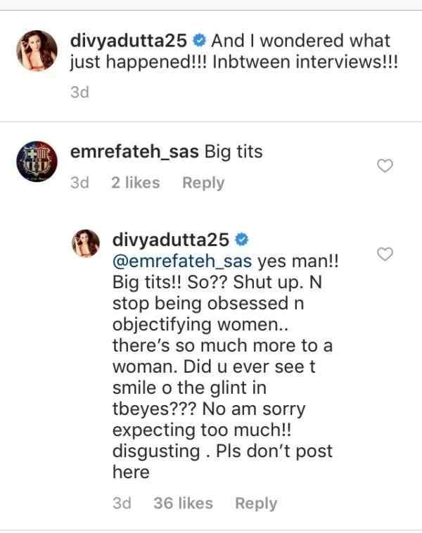 Instead of ignoring the guy, Divya decided to call out the trolling and educate him. “Yes, man!!!” she exclaimed. Big t**s!! So?? what do you think? Keep your mouth shut. Stop obsessing about women and objectifying them. There’s so much more to a woman than that. Did you ever catch a glimpse of my smile or the glint in my eyes??? No, I apologise for expecting too much!! it’s gross Please don’t post anything here.”