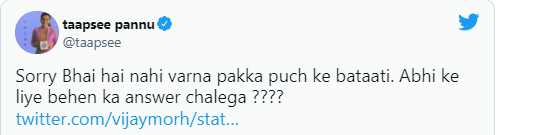 The troller’s remark clearly irritated Taapsee, who responded with an appropriate retort. “She said,” she explained “Sorry, Bhai, but pakka puch kar bataati nahi varna pakka puch kar bataati nahi varna pakka puch kar bataati nah Behan ka response chalega abhi ke liye abhi ke liye abhi ke liye abhi ke “..