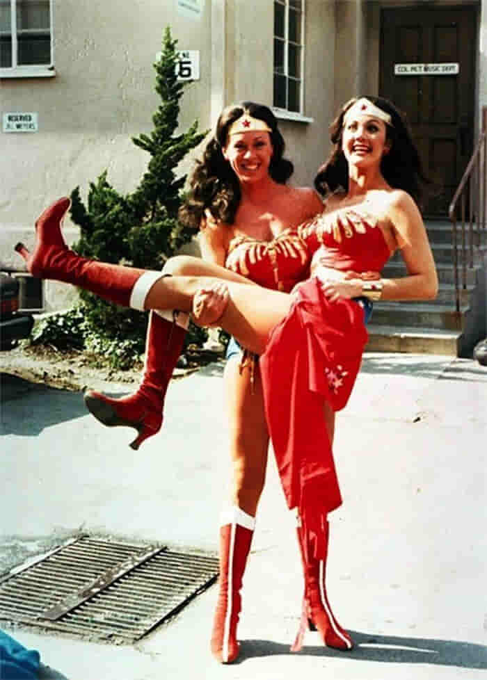 6. Lynda Carter with her Wonder Woman impersonator Jeannie Epper is a writer.
