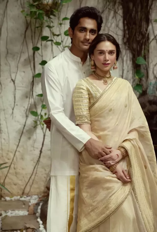 Aditi Rao Hydari shared wedding pictures with her husband Siddharth on Instagram. Aditi transformed into a minimalist bride on her wedding day by dressing in a beige saree and gold jewellery. However, Siddharth looked dashing as he tied the knot with his ladylove in a conventional wedding ceremony, dressed in a white kurta and matching dhoti.