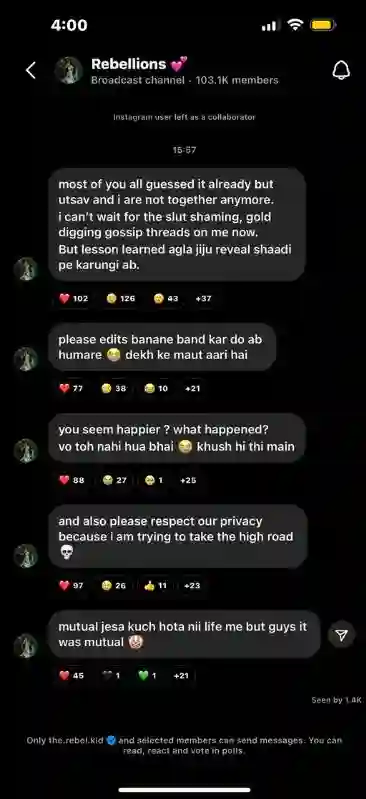 Most of you all guessed it already, but Utsav and I are not together anymore. I can’t wait for the slut shaming, gold-digging gossip threads on me now. But lesson learned agla jiju reveal shaadi pr kaungi ab.
