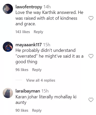 Social media users have expressed varying opinions about Kartik Aaryan’s response and Johar’s handling of the reveal in response to the episode, which has sparked intense debate.