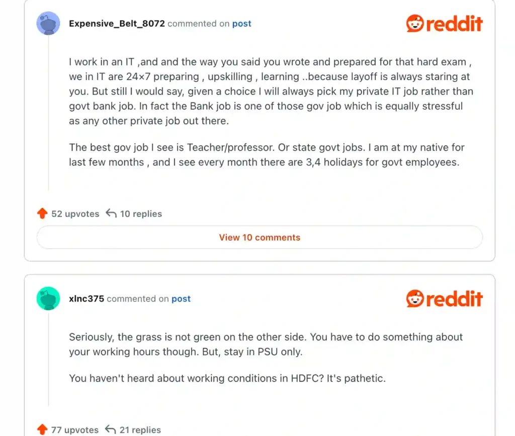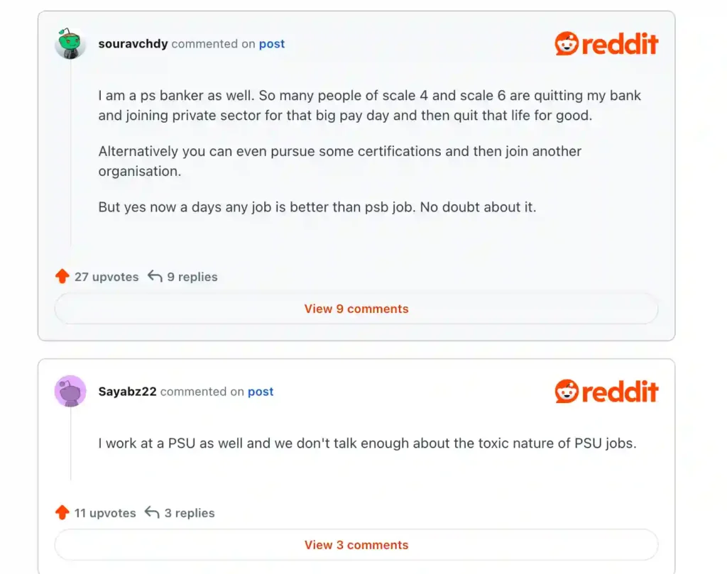 - Empathy Overload: “Same here—15 years in SBI, anxiety attacks monthly. Quit last year, no regrets.” (500+ upvotes).