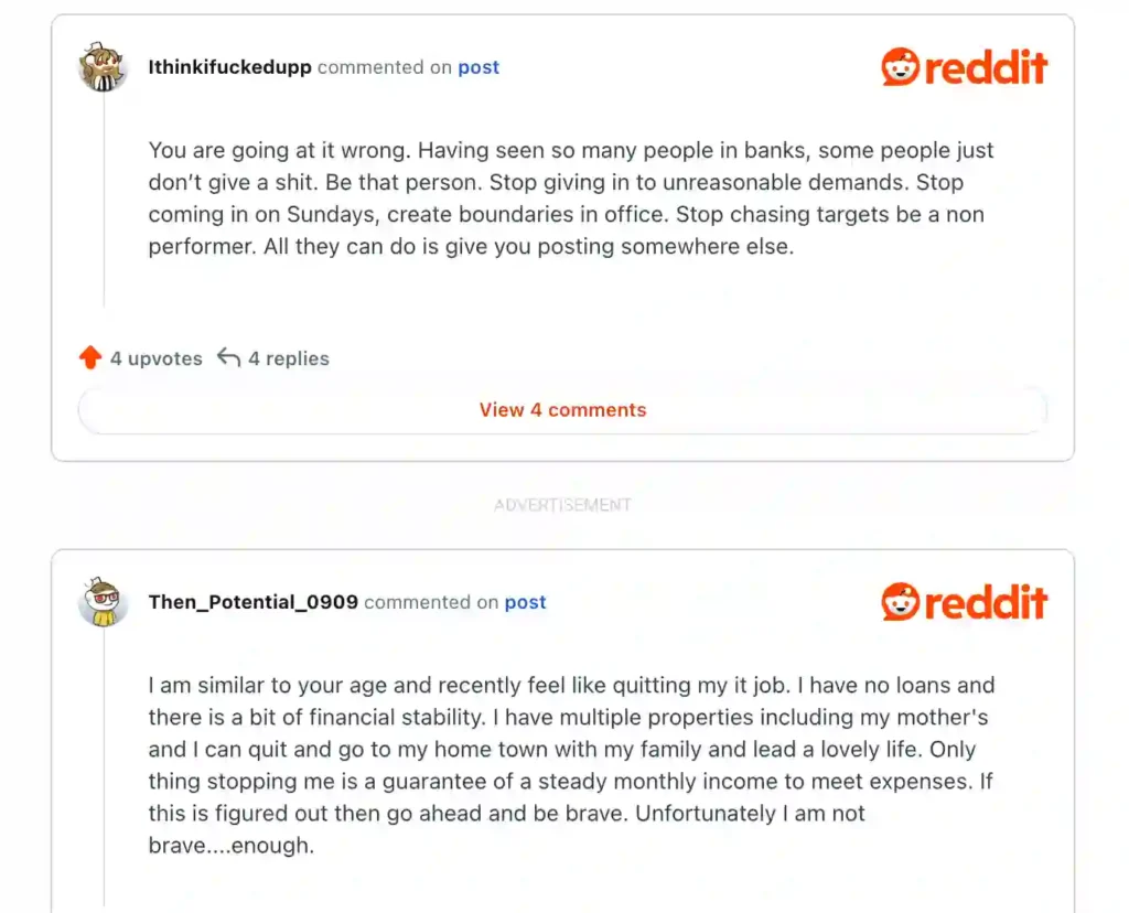 The banker details the government bank job stress: Endless paperwork, unrealistic targets, and a culture where “seniors treat juniors like dirt.” Health took the hit—chronic anxiety, sleepless nights, and a near-breakdown during appraisals. “I no longer feel like I can do justice to myself. I’m scared that one day—like many of my fellow bankers—I might also reach a breaking point,” they wrote. The final straw? Stopping work altogether: “I’ve stopped reporting… Yes, this means my salary will stop. My financial struggles may begin. But I hope—with all my heart—that I’ll get my life back.”