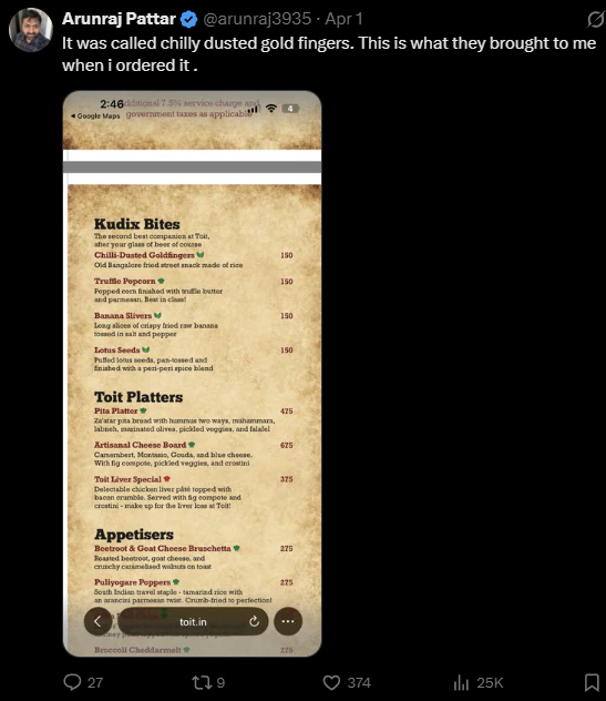 The incident happened at a trendy pub in Bengaluru. The man, excited by the menu description of “Gold Dusted Chicken Fingers,” placed the order expecting something luxurious and Instagram-worthy. When the plate arrived, it looked impressive at first glance — golden, shiny fingers. But upon closer inspection (and tasting), he realised the “gold dust” was just ordinary spiced masala or edible glitter/masala mix, nothing premium or actual gold leaf.