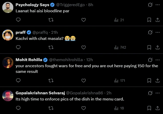 • “He paid ₹150 to realise it’s just masala – peak Bengaluru experience.”