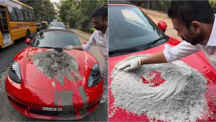 In the video, Hemadri is seen calmly preparing the cement mix directly on the Porsche’s bonnet, spreading it evenly, and levelling the road surface. He later explained that he chose the bonnet because it provided a clean, flat, and stable surface for mixing — a practical (if unconventional) solution in the moment.