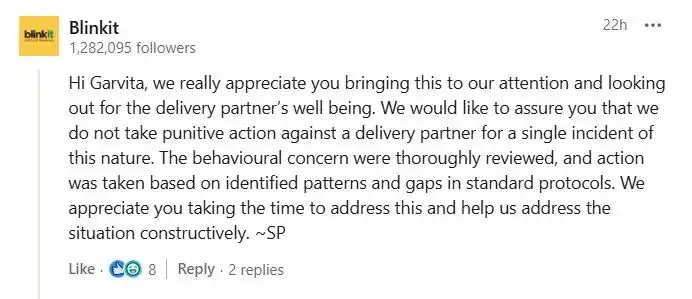 Additionally, Blinkit expressed gratitude to Garvita Khybri for drawing their notice to the issue in a comment on her LinkedIn article, stating,