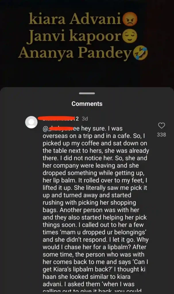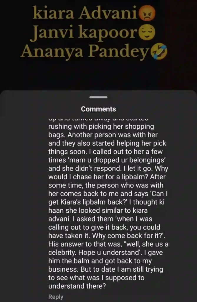After the interview, an online user recounted her personal experience meeting Kiara Advani at a café. She related an occasion in which Kiara’s lip balm spilt close to her, but her helper cleaned and retrieved it right in front of her.