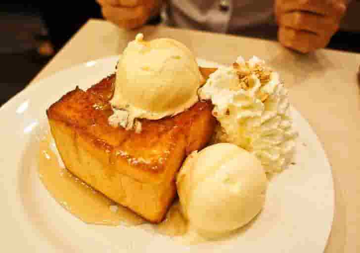This is the kind of morning toast that Englishmen would die for! It’s large, sweet, and delicious. On top of caramelised honey-coated bread, ice cream, fruits, and cream.
