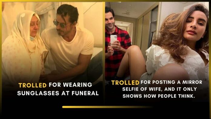 Mandira Bedi was criticised for attending her husband Raj Kaushal’s burial in jeans, and SRK was trolled for attending Dilip Kumar’s funeral in sunglasses. People remarked on his appearance rather than the gesture.
