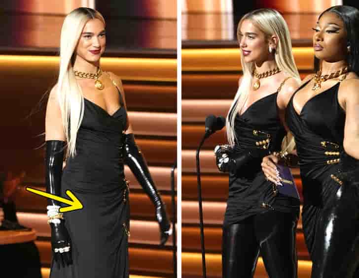 Dua Lipa and Megan Thee Stallion wore long dresses with tight pants underneath.