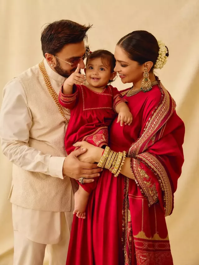 The carousel of four photos is pure festive fairy tale. First up: Deepika cradles a beaming Dua in her arms, the toddler’s eyes sparkling with that innocent mischief only a one-year-old can muster. Dua rocks a red angrakha kurta with salwar, her tiny frame completed by two bouncy ponytails tied with red bands and a cute bindi—talk about mini Deepika vibes! Ranveer, the ultimate doting dad, gazes at his girls with awe, his cream sherwani and beaded necklace adding that regal touch.