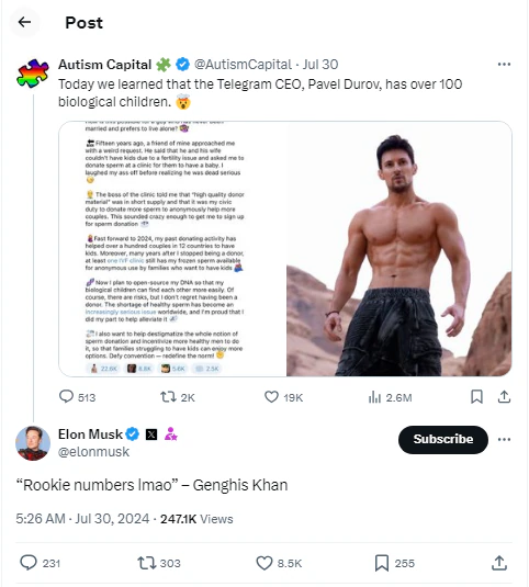 The account “Autism Capital,” which is well-known for its light-hearted commentary on news, shared the revelation on X. The joke in the message was that Durov was trying to outdo “The man with 1000 kids!” The amusing response from Musk was, “Rookie numbersâ€ae. Genghis Khan.”