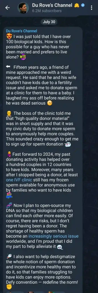 Durov said in his essay about how he ended himself here fifteen years ago at the suggestion of a buddy. “A strange request was made to me by a buddy. Due to a fertility problem, he and his spouse were unable to conceive and asked me to donate sperm to a clinic so that they may become parents. Before I saw he was serious, I laughed,” Durov wrote.