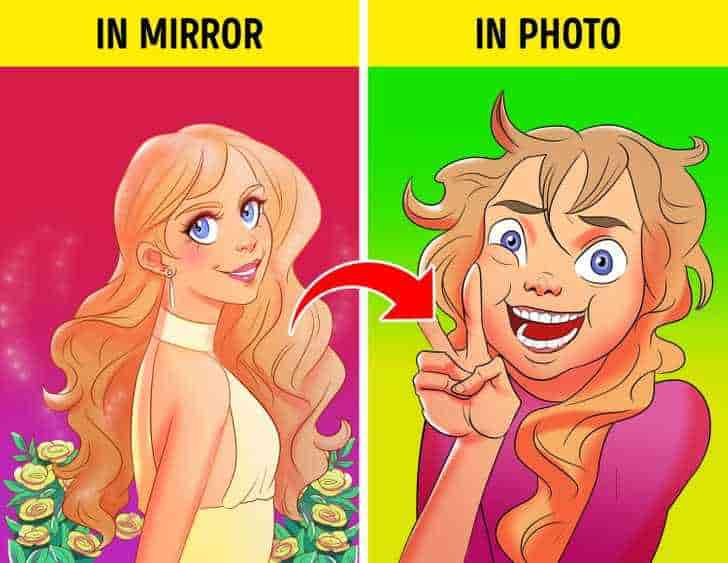 The image in the mirror is a reversed representation of the way we truly look, therefore what we see when we look in the mirror isn’t reality. And because we see ourselves in the mirror every day, we’ve grown accustomed to this inverted version. It’s referred to as the mere effect. So, if you don’t see yourself in images very often, you don’t know what you look like, so be prepared to be surprised.