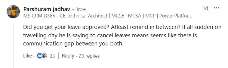 The manager’s alleged last-minute message (screenshot shared alongside) read something like: “Sorry, but project deadline shifted. Need you in the office tomorrow urgently. Leave cancelled.”