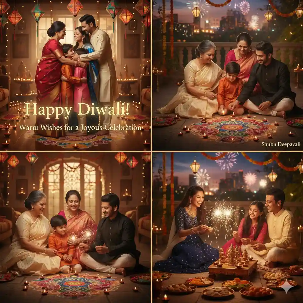 - Traditional Diwali Celebration Scene (Great for Boys & Girls) Prompt: “Generate a vibrant Diwali family celebration with diyas, rangoli patterns, and festive sweets. Include children playing with sparklers, women in colorful sarees, and men in kurta pajamas. Capture the warm glow of diyas and soft firework lighting in the background.” Details: Ideal for WhatsApp status—customize with “add a boy bursting crackers” for boys or “focus on girls in lehengas” for girls. Trending in 2025 for family vibes (searches for “Diwali family images AI” at 20K+).