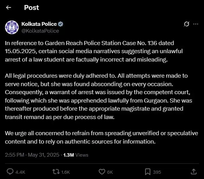 She fled into hiding with her family after the FIR was filed at Garden Reach Police Station, but she was eventually apprehended by a court-issued warrant. She was brought to the Alipore Court in Kolkata shortly after her detention, where the judge imposed a 14-day judicial custody order. Later, Kolkata Police denied accusations that her arrest was unfair and stated on X that it was legal.
