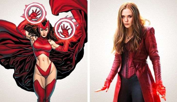 Scarlet Witch is older and wiser in the books, and she usually wears a revealing suit, cloak, and headpiece to help her control her abilities. The female mutant in the movies is more covered and dressed in more everyday clothes.