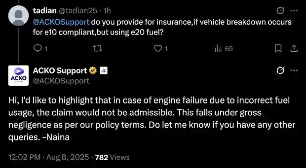 ACKO Insurance support clarifies stance on E20 fuel and insurance coverage