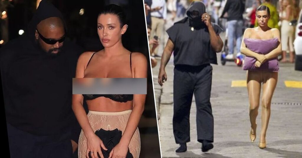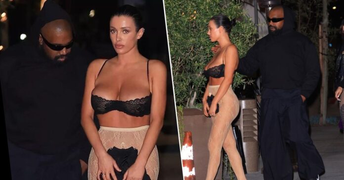 On a date night, Bianca Censori, the wife of Kanye West, was spotted wearing nothing but a busty lace bra and see-through tights, demonstrating her continued penchant for eye-popping risqué public displays.
