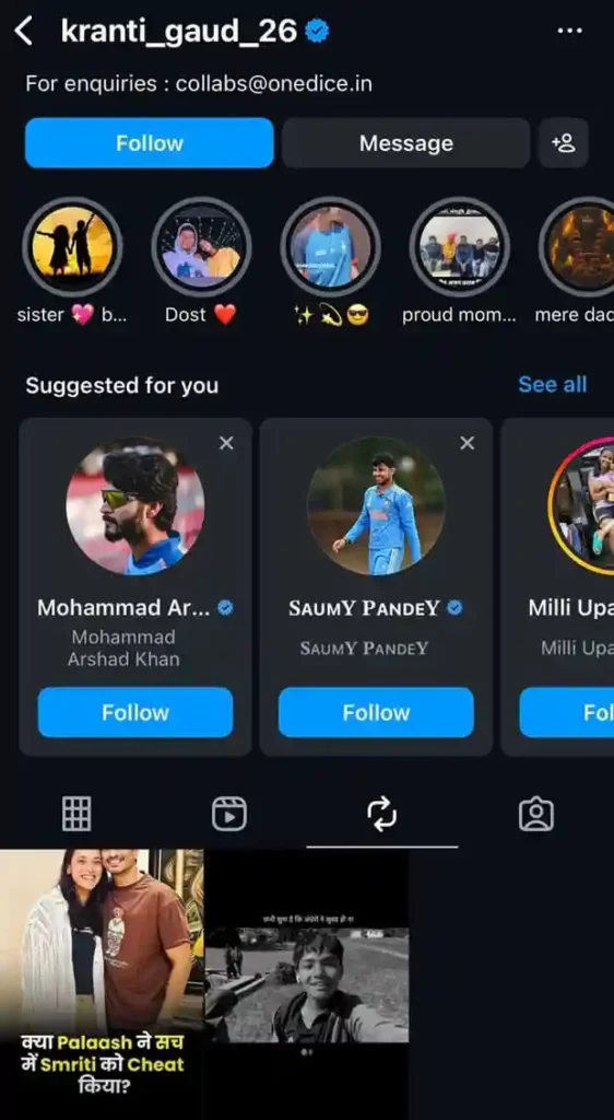Kranti Gaud, the 25-year-old cricketer and Smriti’s close confidante from the Indian women’s team, dropped the digital dynamite on or around December 1, 2025: A repost of an Instagram reel from @hnews, captioned in a way that screamed subtext. The video, a montage of cryptic clips and cheating-themed quips, was interpreted as a veiled validation of the swirling rumors – Palash’s flirty chats with Mary D’Costa from April-May 2025, where he called his long-distance tie with Smriti “dead most” and pitched Marriott meetups for “swim and spa” sessions.