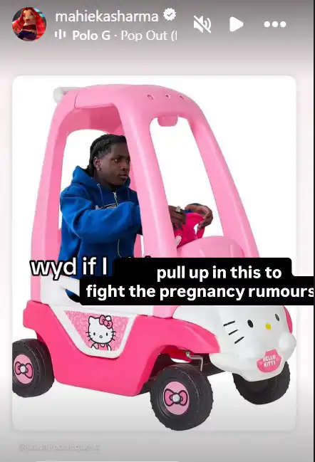 Not stopping there, she swatted the pregnancy pests: A meme of a man cruising in a pink Hello Kitty toy car, quipped