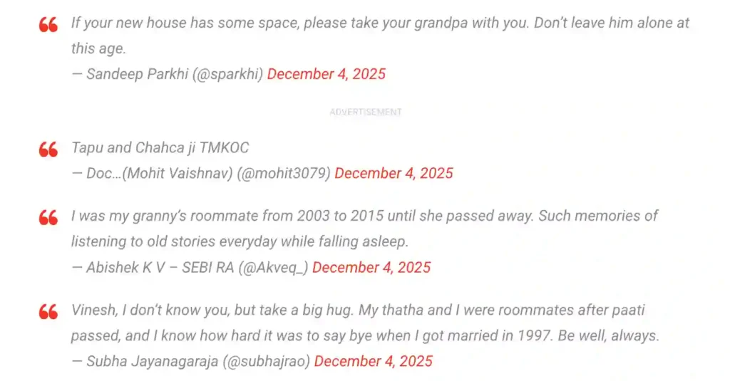 Picture this: Two guys who’ve shared a room, swapped stories, and navigated life’s little dramas for two decades – not college bros or bandmates, but a grandson and his grandpa, turning a simple bedroom into a sanctuary of sorts. That’s the tender truth Vinesh Prabhu dropped on X (formerly Twitter) in late November 2025, announcing their “last official night together as roomies” before his marriage and move-out. What started as a quiet reflection on 20 years of companionship since his grandma’s passing in 2005 exploded into a viral embrace, pulling in over 10,000 likes and a flood of fans sharing their own grandparent glow-ups. If you’re scrolling for the man grandpa roommates 20 years story that’s got the internet ugly-crying in the best way on December 7, 2025, buckle up – this isn’t just a goodbye post; it’s a gentle gut-punch reminding us that the real MVPs of our lives often sleep just a few feet away. From Vinesh’s heartfelt hook to the replies that read like a family reunion, let’s unpack the post that’s proving: Some bonds aren’t built; they’re bunked.