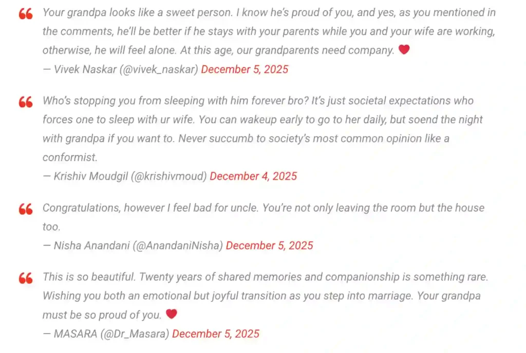- The Sweet Send-Off: “Your grandpa looks like a sweet person. I know he’s proud of you, and yes, as you mentioned in the comments, he’ll be better if he stays with your parents while you and your wife are working, otherwise, he will feel alone. At this age, our grandparents need company. ❤️” – Vivek Naskar’s nurturing nudge, 250 likes, a gentle guide to the golden years.