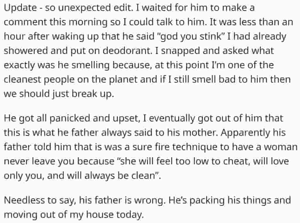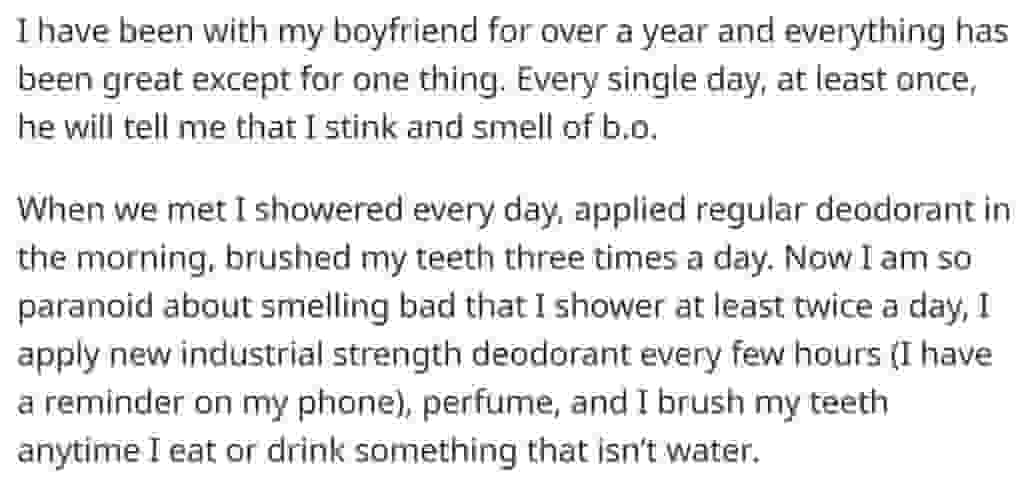 A lady recently stated on Reddit that her boyfriend tells her she stinks every day. However, a dramatic twist later exposed the true cause for his actions.