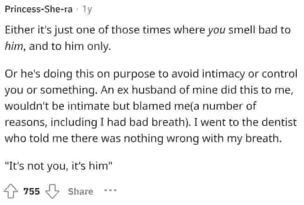 Many people suggested that she may have illusionary sensors that cause her boyfriend to believe he smells something after reading about her circumstance. Or perhaps he was attempting to manipulate her. One person suggested that if he says that every day, regardless of the cause, they aren’t compatible and should break up as soon as possible.