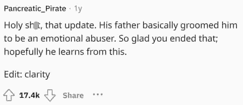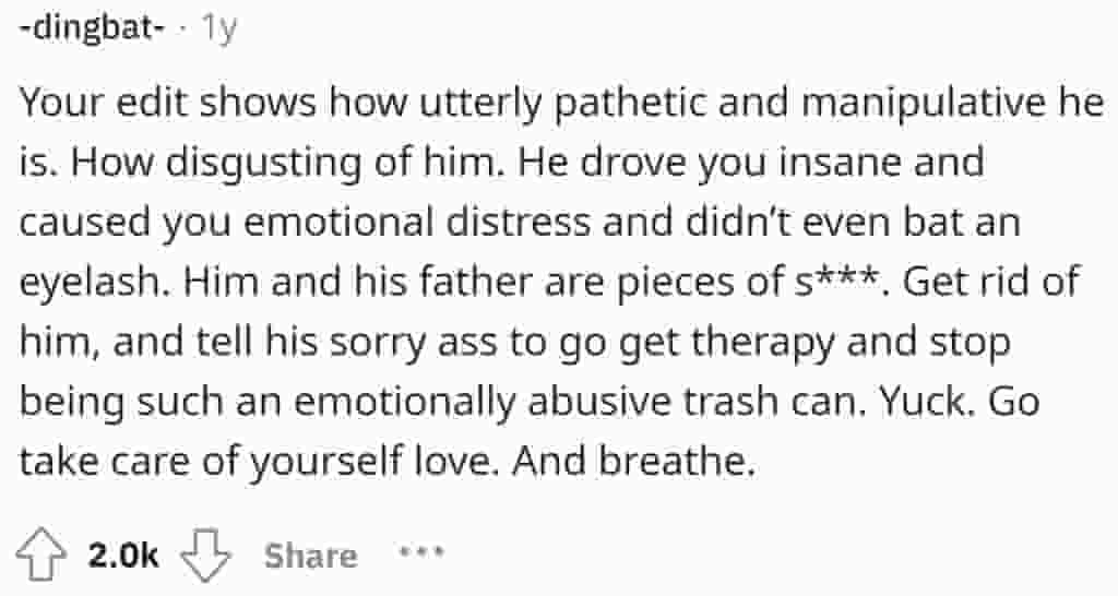 Her boyfriend, it turns out, learned how to emotionally abuse and manipulate women into having poor self-esteem, which makes them less inclined to betray. His father, in particular, used to tell his mother she smelled bad, believing it was a sure-fire way to get a lady who would never leave you, would only love you, and would always be clean.
