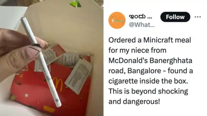 The customer shared a screenshot of a LinkedIn post in which she voiced her displeasure over the startling discovery of a cigarette in a child’s meal box that was bought from McDonald’s Bannerghatta Road in Bengaluru via Zomato.