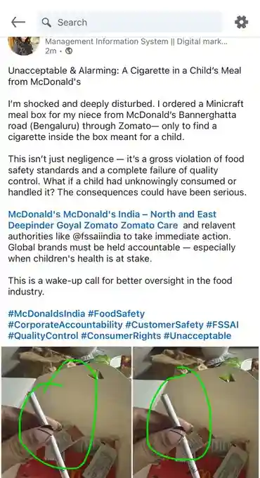 Ordered a Minicraft meal for my niece from McDonald’s Banerghhata road, Bangalore – found a cigarette inside the box. This is beyond shocking and dangerous! @McDonaldsIndia @fssaiindia @zomato @deepigoyal please take urgent action. #FoodSafety #McDonaldsIndia