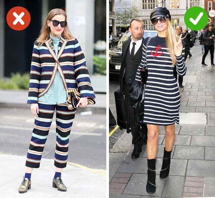In fact, clothing style, as well as the colour and breadth of stripes, are important. The body is given more volume by large contrast lines. It is visually lengthened by narrow horizontal stripes.