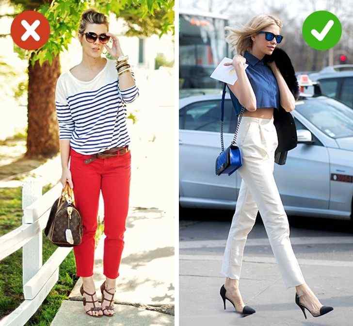 Ankle leggings in bright hues, according to stylists, can visually shorten the body. Short women should choose models with high waists in calm colours and wear them with heels.