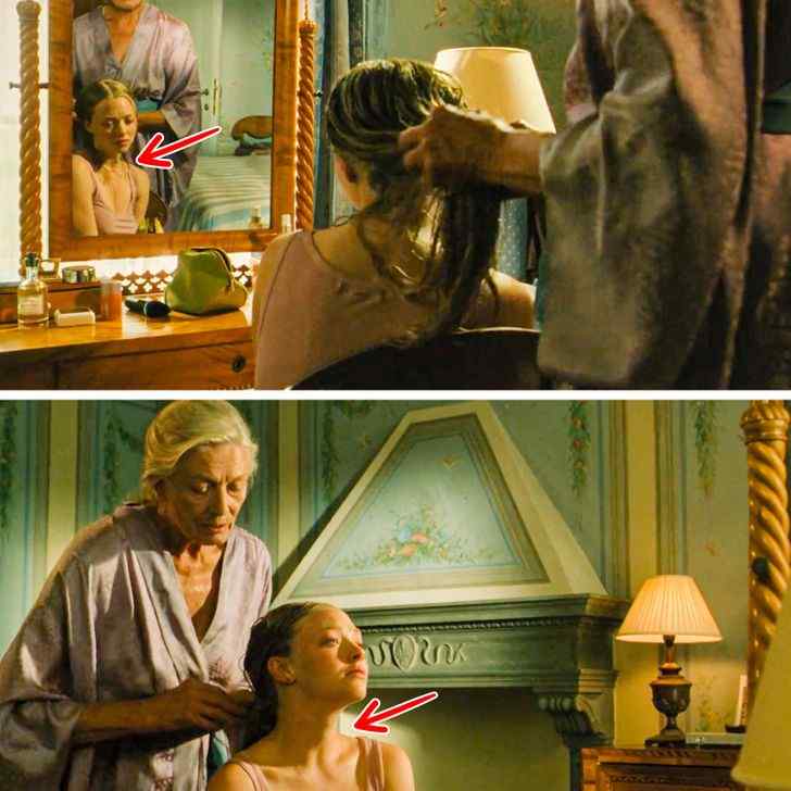 Letters to Juliet is a romantic drama featuring Amanda Seyfried in which she tries to help Vanessa Redgrave’s character rediscover a love she had as a child. Redgrave’s character irons the protagonist’s hair in a sequence that both characters share. While a few short strands of Amanda’s hair are left on her neck in the first photo as she pulls all her hair back, her hair is completely knotted up in the second frame.