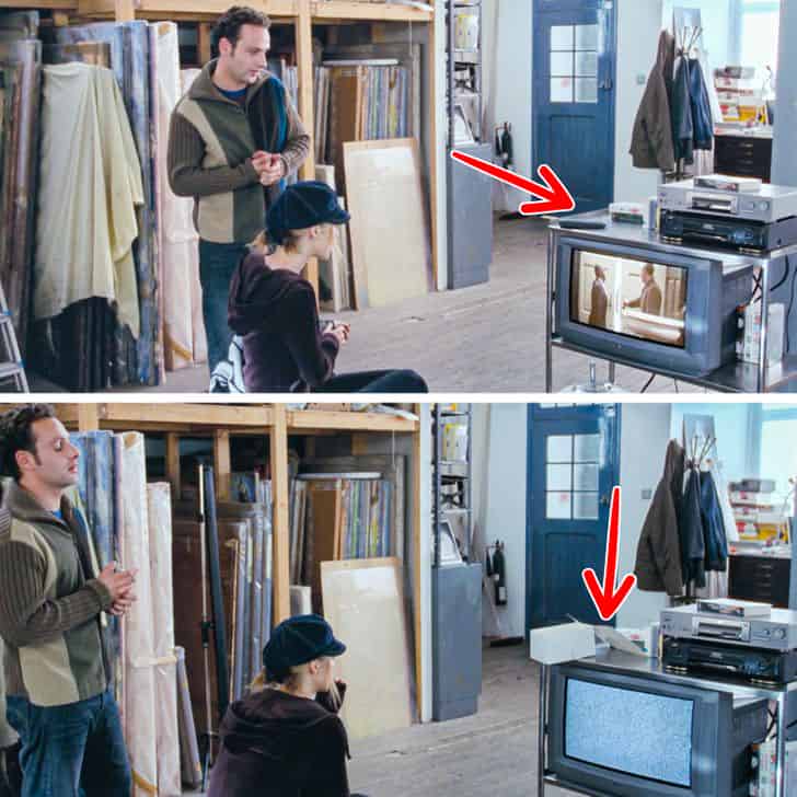 Love Actually is a big-budget romantic comedy with a big cast and a wide range of emotional and engaging stories. It’s normal for certain details to slip between the cracks in a production of this magnitude. The sequence in which Andrew Lincoln’s character shows Keira Knightley the film of their wedding is an example of this. There are other devices on top of the TV as he plays the video, which miraculously disappear when the video ends and the shot returns.