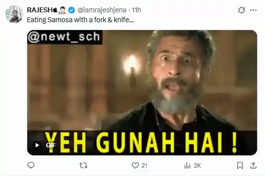 Gems like “If you’re asked to eat samosa like this, run from those fake people” and “Chutney retires before your first bite” are leading the meme charge on X.