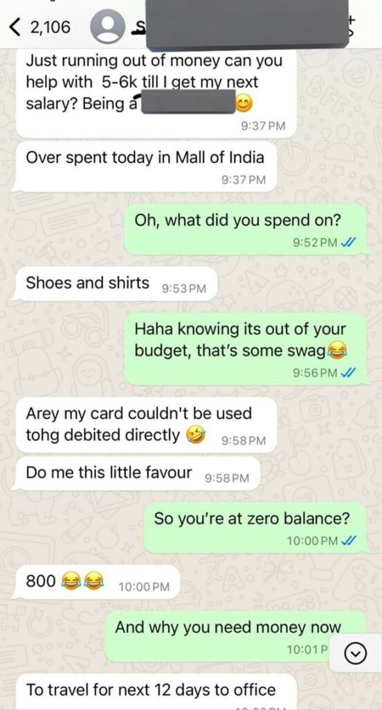 The same woman approached the man for financial help once more in another screenshot, asking for ₹5,000 to ₹6,000 after going over budget at the Mall of India in Noida. According to the screenshot, the man inquired about her purchases. She spoke of clothing and shoes.