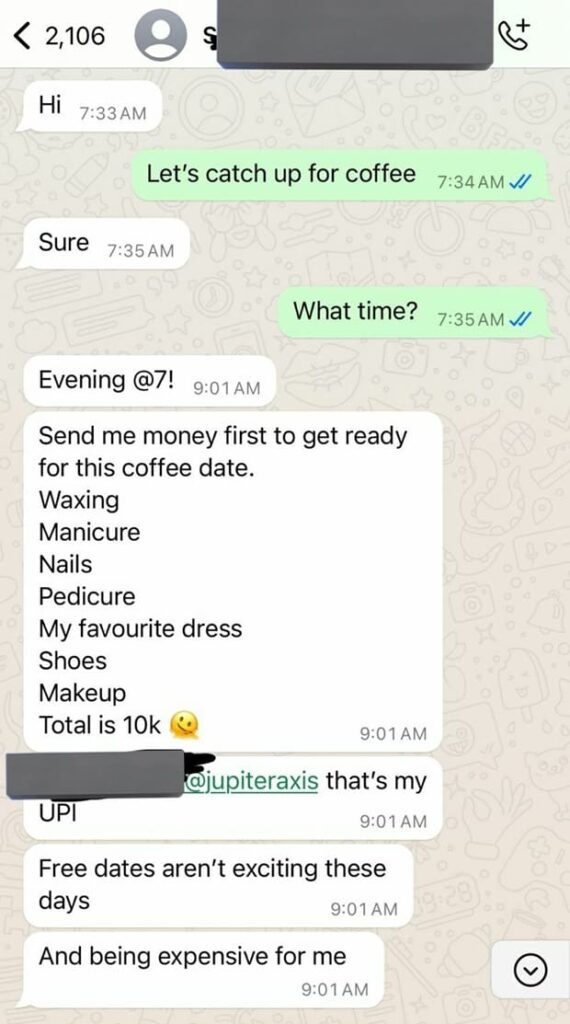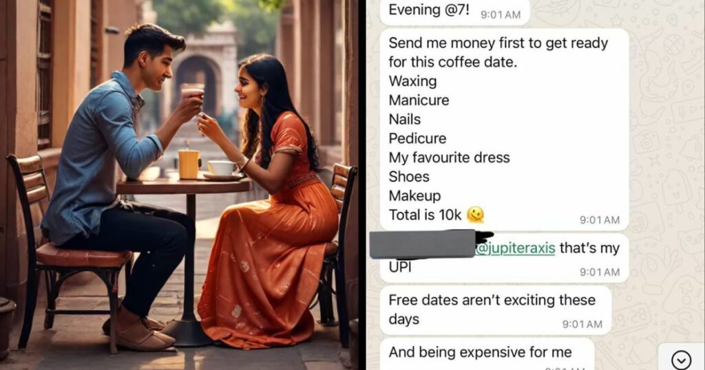 The woman requested ₹10,000 in advance from the man to pay costs such as clothes, makeup, manicures, and waxing before they agreed to meet for coffee in their first conversation. She used the argument that free dates were boring in the present era to support her request. By presenting her UPI ID, she created a precedent highlighting how dating changes.