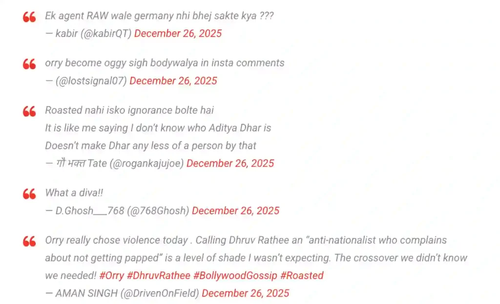 The comments? Catnip for the crowd – screenshots shared by X warrior @BasedMohit as “Orry brutally roasted German Shepherd Dhruv Rathee,” racking 10K likes and a legion of “legend” labels. By December 27, 2025, Orry’s oratory outpaced the original vid, with 500K+ impressions – a roast that roasted the roaster right back.