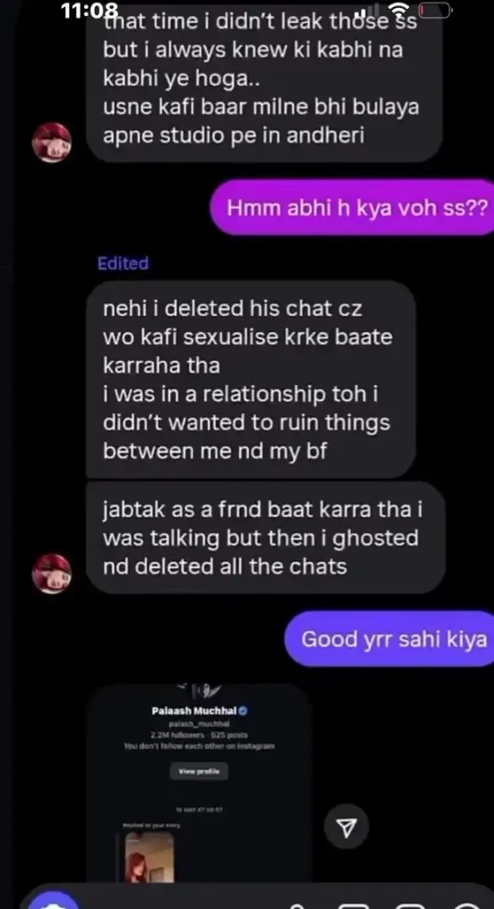 Enter the escalation: On November 27, 2025, an anonymous woman posted on r/IndiaCricketGossips, detailing her own ordeal with Palash. She accused him of “repeatedly trying to initiate inappropriate chats” on WhatsApp, pushing for sexual conversations despite knowing about his commitment to Smriti. “He invited me to his studio multiple times, which I refused,” she revealed, claiming he continued engaging with her Instagram stories – heart emojis on posts, persistent pings for “s*xual conversations.”