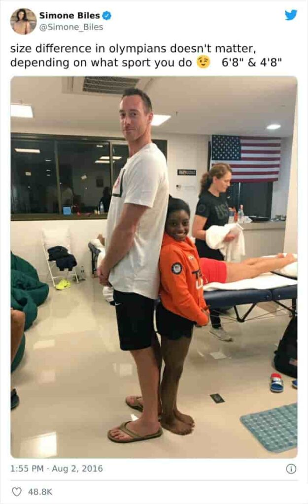 Simone Biles and David Lee, a US volleyball player, are different sizes.