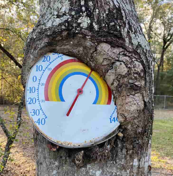 “My father’s thermometer is being swallowed by his tree.”
