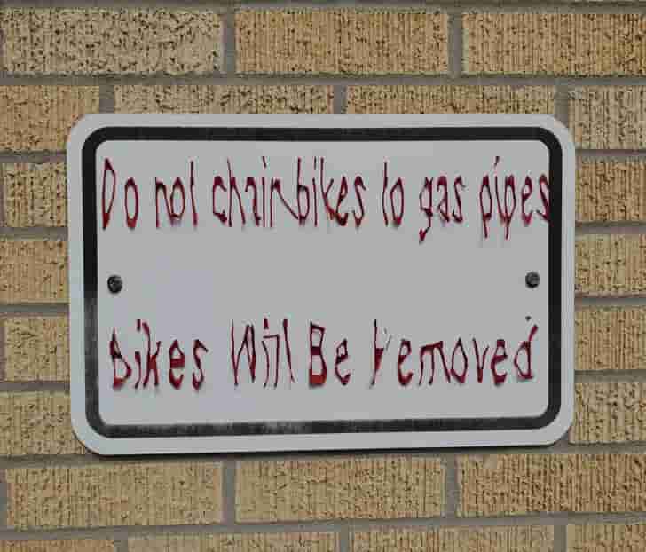 “This weathered sign in front of my office that seems like it fits in a horror movie”