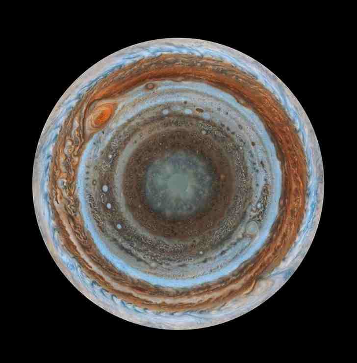 When you first look at the semi-sphere, you might be sceptical about the photo of the Solar System’s largest planet. The reality is that the first picture is a true image returned by the Cassini space probe as it orbited Saturn. Cassini took a snapshot of Jupiter’s south pole at the end of 2000 while on its way to Saturn. This image is available on NASA’s website.