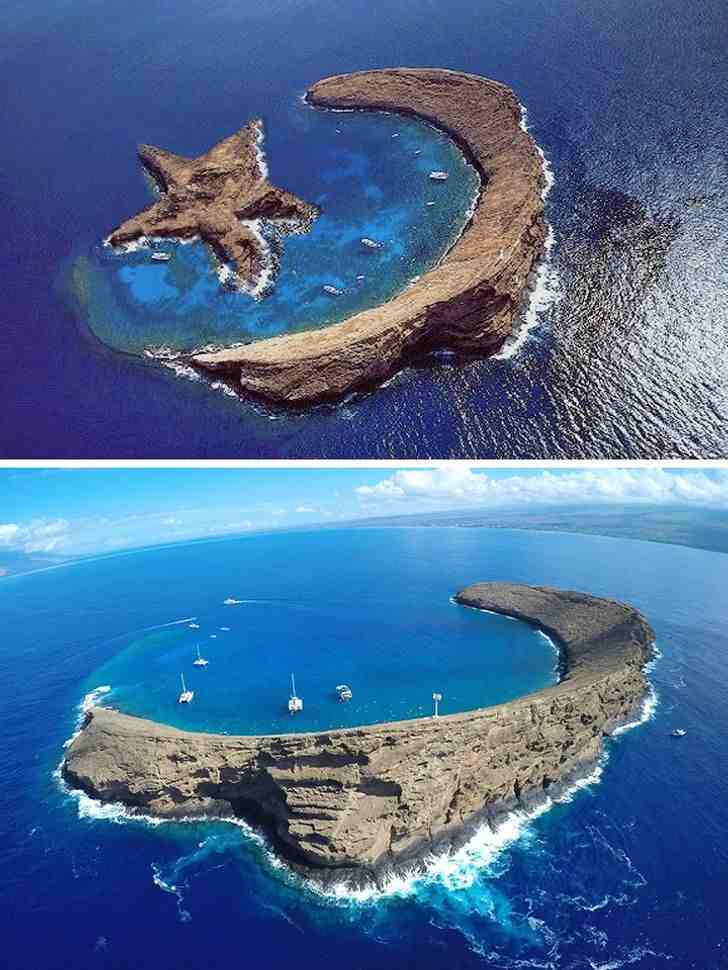 The photo’s well-known explanation is “The Island of Molokini – a natural star and crescent – located between Maui and Kahoolawe, Hawaii.” The only truth here is the island’s name, Molokini, which is shaped like a crescent. A picture editor was used to add a star.